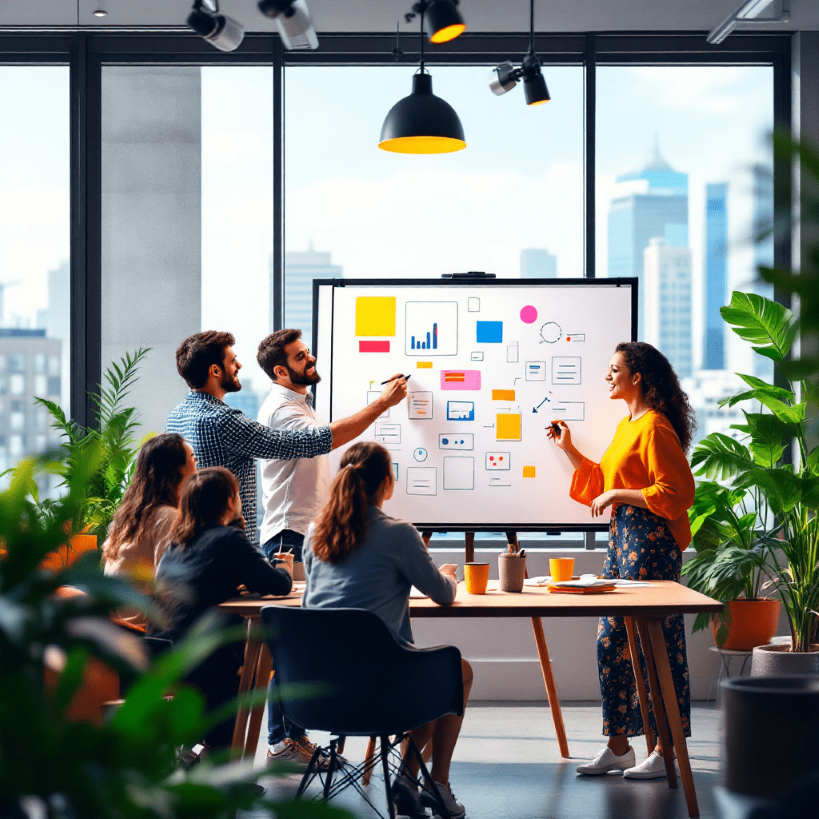 Grupo de profissionais discutindo estratégias criativas de criação de sites, representando o planejamento digital da Black Friday.