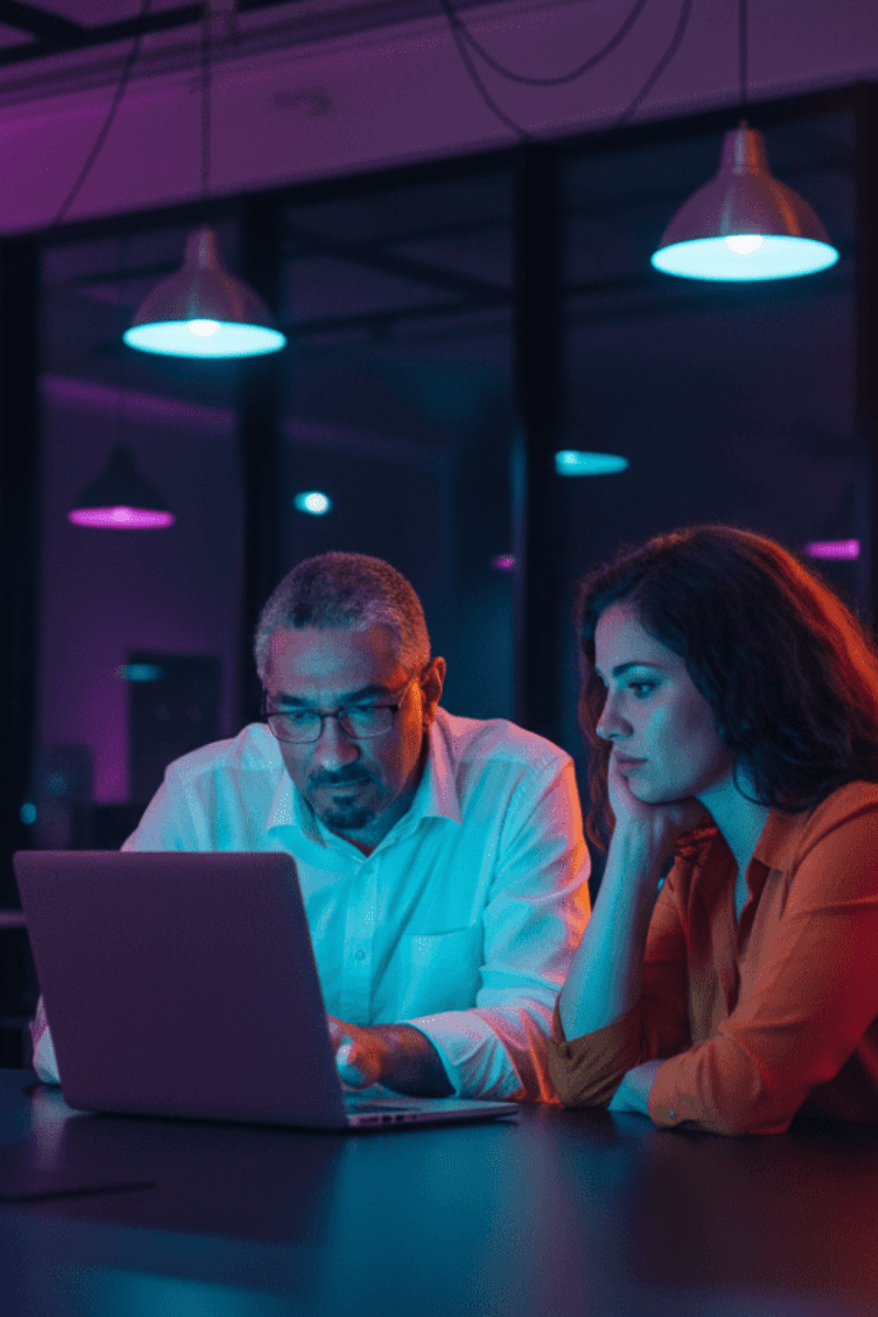 Imagem de dois profissionais colaborando em um ambiente de escritório moderno e iluminado, simbolizando produtividade e inovação. Essa foto representa o espírito das ofertas de Black Friday da Dobra 7 Digital, com foco em criação de sites modernos, criativos e otimizados para SEO, ideais para empresas que querem se destacar online durante a temporada de promoções.