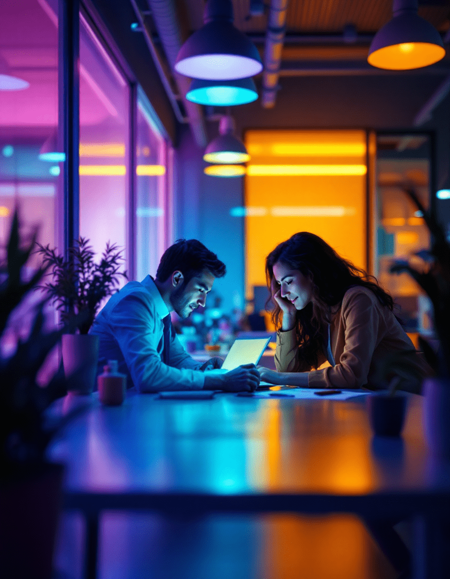 Imagem de dois profissionais colaborando em um ambiente de escritório moderno e iluminado, simbolizando produtividade e inovação. Essa foto representa o espírito das ofertas de Black Friday da Dobra 7 Digital, com foco em criação de sites modernos, criativos e otimizados para SEO, ideais para empresas que querem se destacar online durante a temporada de promoções.